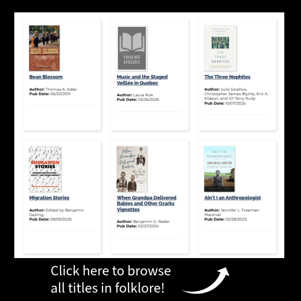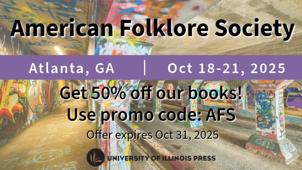 Welcome to the University of Illinois Press virtual exhibit for the 2025 American Folklore Society annual conference! Use the promo code AFS for 50% off of all folklore books when ordering from our website, October 18-31, 2025.